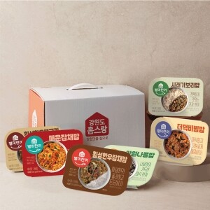 매운잡채밥 - 쌀(국산), 당면(중국산/고구마전분, 타피오카전분, 전분가공품), 양파(국산), 돼지고기(국산), 당근, 소스1, 소스2, 표고버섯, 곤드레, 대두유, 혼합간장, 당류가공품, 참기름, 소스3, 물엿, 향미유, 고추장, 전분가공품, 고춧가루, 마늘, 천일염, 혼합제제(스모크향, 부분경화대두유), 천연향신료 / 강원나물밥 - 쌀(국산), 곤드레(국산/강원도), 참취(국산/강원도), 들기름, 감자, 간장양념소스, 표고버섯, 당근, 곰취(국산/강원도), 어수리(국산/강원도), 혼합간장, 소스, 물엿, 한식간장, 천일염, 복합조미식품 / 강원도시래기보리밥 - 쌀(국산), 무청시래기(국산/강원도), 찰보리(국산), 된장, 고추장, 마늘, 대파, 한식간장,, 당류가공품, 들기름, 참깨, 천일염, 복합조미식품 / 더덕비빔밥 - 쌀(국산), 시금치(국산), 생더덕무침[더덕(국산) 63.89 %, 물엿, 고춧가루(중국산), 마늘, 기설탕], 고추장, 참름, 들기름, 천일염, 양파, 고춧가루, 물엿, 음료베이스, 참깨 / 맛있는잡채 - 당면(중국산/고구마전분,전분가공품), 양파(국산), 곤드레(국산/강원도) 11.17 %, 혼합간장(탈지대두,천일염,소맥,기타과장,호모추출분말), 당근(국산), 당류가공품, 시금치(국산), 대두유참기름, 파프리카(국산), 향미유, 복합조미식품, 천일염, 천연향신료 / 횡성한우잡채 - 당면(중국산/고구마전분,전분가공품), 쇠고기(국산/횡성),양파(국산), 혼합간장[탈지대두,천일염,소맥,기타과당, 효모추출분말], 당근(국산),시금치(국산), 당류가공품,대두유,참기름,파프리카(국산),소스, 향미유, 복합조미식품, 천연향신료 |